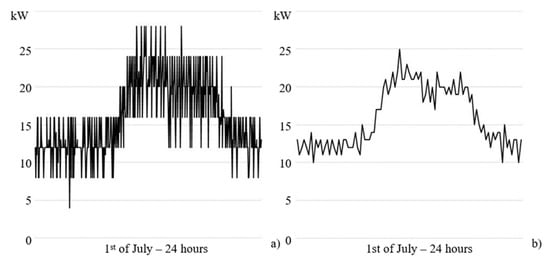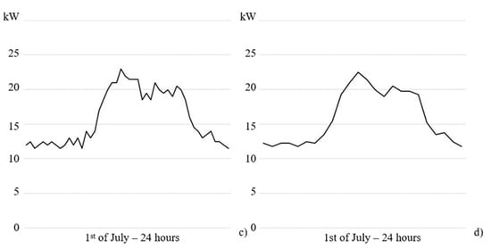 As an example, Figure 3 illustrates the load profile on 1st of July; in particular, Figure 3a illustrates the load profile as it has been returned by the smart meter whereas Figure 3b–d illustrate the time-averaged load profiles.