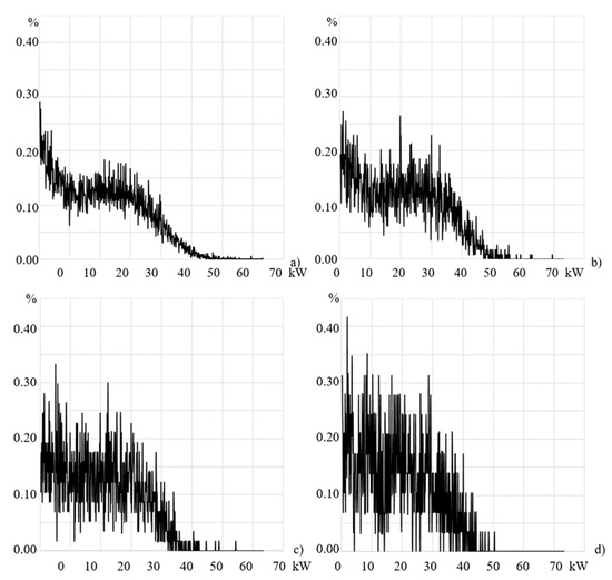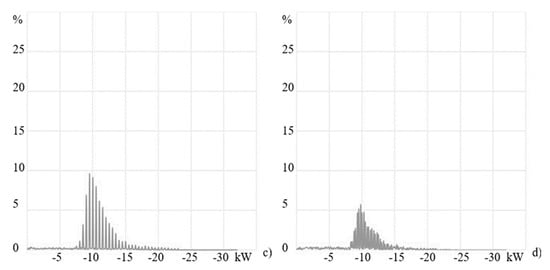 When the temporal resolution is 3 min, the discharge of the storage system covers the 32.46% of PBES and the average value of powers during the discharge is 10.78 kW, as in the fifth and sixth rows of Table 7. The authors approximate these negative values of PBES to integers and calculate their recurrences, as already explained and done in the previous paragraph. Figure 6a shows the recurrences of values of PBES. Some of these values clearly recur more than others and cause spikes. Recurrences of 12 kW, and 8 kW are 26.24%, and 20.50%, respectively. These two values count almost half of the recurrences. With the exception of 16 kW, which recurs approximately 3%, the remaining values have negligible recurrences. As the temporal resolution get worst, the distribution of recurrences changes and it completely loses spikes. Indeed, the distribution of recurrences for R15, R30 and R60 shown in Figure 6b–d clearly indicates that the more the temporal resolution get worst, the more the discharge of the storage system tends to a unique value, that is 10 kW. The conclusion is that the three-minute temporal resolution allows a set of powers to be identified most frequently exported by the storage system. In other words, the discharge of the storage system takes place in correspondence with a restricted set of power values. The 60-min temporal resolution causes the total loss of this information; the discharge tends to concentrate in the close neighborhood of a single value that, in a high temporal resolution, might count zero times.