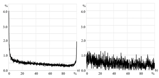 The previous three paragraphs have studied the influence of the temporal resolution on the utilization rate, the recharge, and the discharge of the storage system. The batteries storage system profile has been the basis of such a study. This paragraph illustrates a similar study but, this time, the basis of the study is the profile of the state of charge (SOC) []. As usual in this field, such a profile is a string of numbers in the range 0–100%; the string length depends on the temporal resolution, it decreases from 175,200 to 8760 values when the temporal resolution changes from 3 to 60 min. The recurrences of SOC’s profile for a three-minute temporal resolution are reported in Figure 7a; this temporal resolution returns a fairly sharp curve where most of the recurrences are equal to about 0.05%. Two spikes are on the range boundaries: If the SOC tends to 0% then the recurrence tends to 4% while if SOC tends to 100%, then the recurrence tends to 2%.