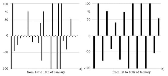 This said, the SOC profile in the first ten days of January is divided into M = 240 substrings for a three-minute temporal resolution, or into M = 16 substrings for a 60min temporal resolution. These substrings are shown in Figure 8. The three-minutes temporal resolution allows the true understanding of the use of the batteries. In Figure 8a the storage system executes four 100% recharges, two 75% recharges, one 50% recharge and one 40% recharge; it also executes four 100% discharges, one 75% discharge, two 50% 50% discharges and five discharges within 1–25% range. The 60-min temporal resolution makes the identification of the use of the batteries less precise, indeed in Figure 8b the storage system executes eight discharge/recharge cycles in alternation: Four 100% discharge/recharge, two 75% discharge/recharge, one 50% discharge/recharge and one 40% discharge/recharge. The conclusion is that the 60-min temporal resolution simplifies the use of the storage system, masks both the charges and discharges with small amplitude, and promotes those with a larger amplitude.