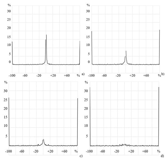 The conclusion reported above is the result of a ten-days period of observation, from the 1 to 10 January, It is opportune to verify such a conclusion over a wider period, i.e., the entire year. To this end, Figure 9a shows the recurrences of all substrings of the SOC profile for a 3-min temporal resolution. On the left of Figure 9a, sub (−100%) indicates a full discharge and it recurs 13.63%; on the right of Figure 9a, sub (+100%) indicates a full recharge and it recurs 14.10%. Recurrences of full discharges and full recharges almost coincide each other. Figure 9a also shows that almost all the remaining substrings have negligible recurrences, except for the substrings in the narrow range around zero, i.e., sub (±4%) whose recurrence is about 15–20%. Similarly, Figure 9b–d show the recurrences for temporal resolutions equal to 15, 30 and 60 min, respectively; an evident result is that recurrences of both sub (−100%) and sub (+100%) progressively increase up to about 32%, that is a value two times greater than that measured with a 3-min temporal resolution. Another evident result is that the recurrences of the substrings in the narrow range around zero, i.e., sub (±4%), tends to zero. The conclusion is that dividing the profile of the state of charge of the storage system into substrings and studying these substrings is a valid tool to understand the use of the batteries. The temporal resolution affects the validity of the results from this study, and in particular, the 60-min temporal resolution strongly simplifies the operation of the batteries that tends to an alternation of recharges and discharges of equal amplitude.