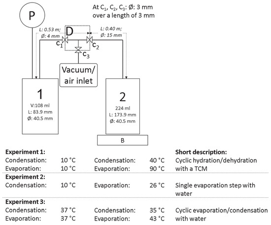 Experiment 1: Goal: To screen the potential NCG effect on the vacuum reactor performance in a hydration and dehydration experiment. The first experiment starts with a purified anhydrous KCO composite (produced by Caldic with an after treatment what removed all KHCO content) in vessel 2 and a limited amount of liquid water (35 mL) in vessel 1. The second started with a purified hydrated KCO1.5HO composite (produced by Caldic) in vessel 2 and initially an empty vessel 1. The temperature conditions in both experiments are similar: the temperature of vessel 2 varied between 40 and 90 C and vessel 1 was kept at 10 C. The exact hydration/dehydration conditions of KCO are described in more detail in the literature [25]).