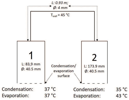 A vacuum system is constructed (see Figure 1) to study the effect of NCG on the evaporation/condensation rate. It consists of two vacuum vessels (vessel 1:108 mL and vessel 2:224 mL), wherein the temperature of the walls can be controlled (vessel 1 between −20 and 80 C; vessel 2 between room temperature and 200 C). The temperature of vessel 1 is controlled with a thermostat bath with an accuracy of 0.1 C (Lauda ECO Silver), active cooling and heating of vessel 1 is possible. The temperature of vessel 2 is controlled with a heat resistor with an accuracy of 0.5 C (heating power of 30 W), only active heating is possible, cooling is by heat losses to the environment. The thermocouple for adjusting the temperature of vessel 2 is located at the bottom of the vessel. This location may result in small deviations between the temperature of thermocouple and the evaporation/condensation surface of the sample as the heat conductivity of water is low (0.6 W/(m·K)).