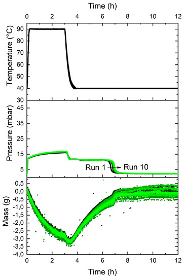In a second experiment, starting with hydrated KCO, no extra water was added in vessel 1, consequently eliminating one of the sources of NCG of the first experiment. The leakage rate in this experiment is extremely low (0.05 mbar/day), so almost no NCG entered the experiment. The experiment is plotted in Figure 5. As can be seen, all mass curves during hydration/dehydration cycles are overlapping and only a small increase in vapor pressure is observed during hydration. The drop in pressure after 7 h is observed as all water of vessel 1 is hydrated on the TCM. Note that even after 8 cycles, the observed pressure during dehydration is significantly lower than that, of experiment 1A. The difference in observed pressure in the first run is most likely a result of the NCG dissolved in the water in experiment 1A, which was absent in experiment 1B. In addition, the low leakage rate of experiment 1B result in a low increase of pressure over the different cycles in experiment B compared to experiment A. The difference in performance over multiple cycles is significant, what according to us is a result of the different amount of NCG in the setup.