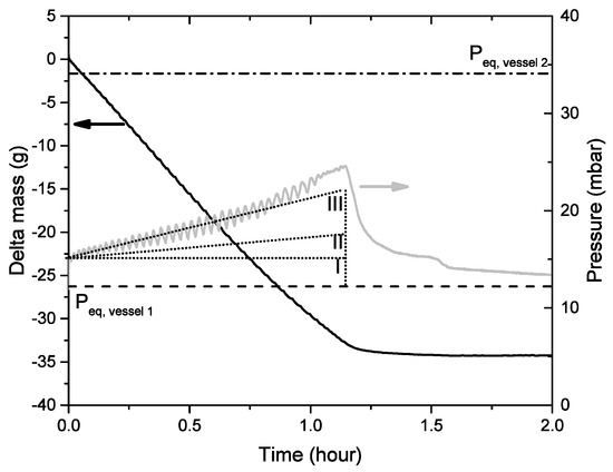 Left axis: Mass change of vessel 2 during evaporation (solid line). Right axis: Pressure in setup during mass transport from vessel 2 into 1 (grey line). The equilibrium pressures of vessel 1 and 2 are indicated by the dashed (–) the and dot-dashed (·–) lines respectively. The three dotted (…) lines represents the thinking model (see Figure 7) explaining the pressure increase during the evaporation/condensation: case I ( no non-condensable gases (NCG) are present in the system), case II (only NCG as result of leakage of the setup) and case III (NCG as result of leakage and dissolved NCG).