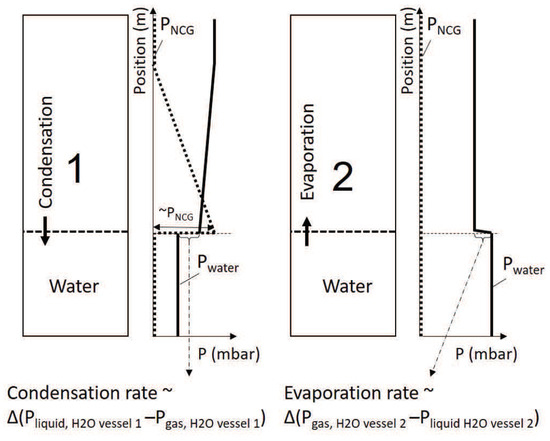 Here, and (Pa) are the water vapor pressures in the liquid and the vapor phases, respectively and and (K), the temperatures in the liquid and the vapor, respectively. Moreover, R is the ideal gas constant. The coefficients and (-) are the evaporation coefficient and the condensation coefficient, respectively, represent the probabilities of molecular emission from the liquid to the vapor or vica versa and mainly depend on the temperature and the pressure [34]. They have been determined experimentally and reported in the literature [34,38]. Our model assumes that the NCG are not affecting the condensation/evaporation rate directly. As NCG might impact on the water transport from the surface to the vessel, they will indirectly affect the mass flux by changing the above the condensation/evaporation surface.