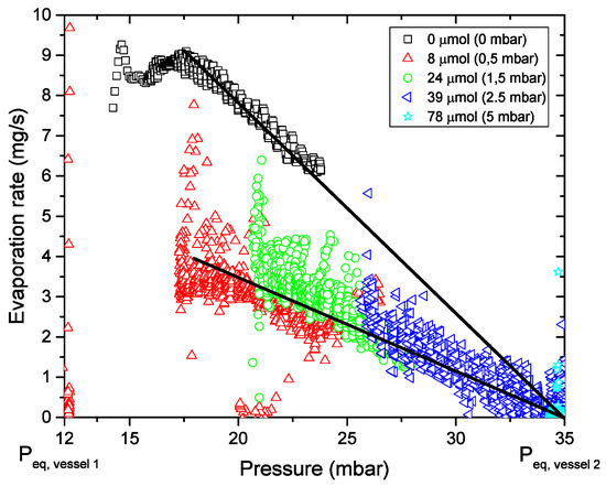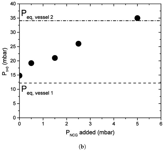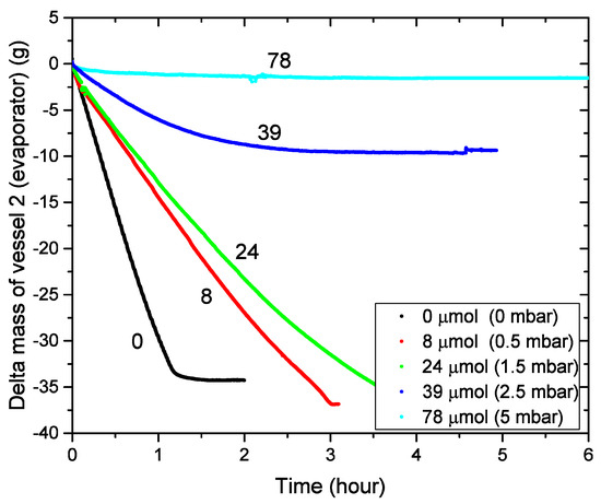 In Figure 8 and Figure 9a,b, five experiments are summarized with different initial amounts of NCG (given in the legend) in the system whereby the same experimental conditions are used as in Section 4.3. The NCG is air from the atmosphere: mainly N and O. In Figure 9b, the pressure after opening valve C is plotted against the average P in the system. We assume the NCG in the system are directly transferred to vessel 1 after opening valve C. An almost linear relation between the measured average vapor pressure and the average initial amount of NCG is observed, fitting with the hypothesis that the NCG will influence the condensation rate and therefore increase the vapor pressure in the system. The evaporation rate (mass decrease) is strongly dependent on the amount of NCG in the system: it decreases rapidly with increasing initial NCG content in the system. At a NCG level of 78 mol (average = 5 mbar) in the setup, the condensation/evaporation process almost immediately stopped, wheras for 39 mol of NCG (average = 2.5 mbar) the process is blocked after 3.5 h. In case the mass transport stops (or decreases to a non-measurable value), the total vapor pressure in the setup is equal to the theoretical water vapor pressure of the evaporation vessel (vessel 2), implying that a high concentration of NCG is located at the condensation surface in vessel 1. From that moment on, the mass transport is dominated by diffusion and not driven by a pressure difference, this process is several orders slower, no mass loss is observed in vessel 2. As there is no pressure difference within the setup, the concentration of NCG at the condensation surface should be equal to the water vapor pressure difference between vessel 1 and 2. In that case, no net condensation will occur at that surface.