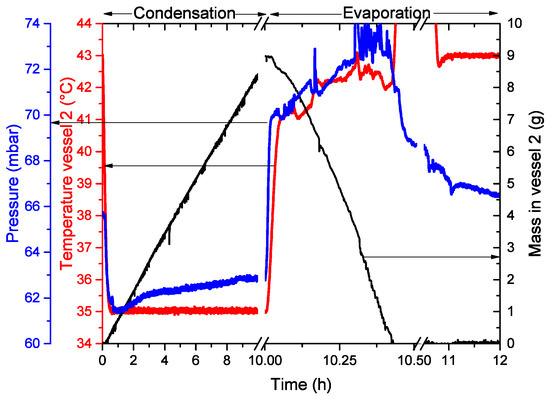 During condensation in vessel 2, the pressure is slowly reaching a pressure close to the water equilibrium pressure 62.6 mbar at 37 C. During evaporation from vessel 2 to vessel 1, the pressure is increasing in time, similar to the single evaporation experiments. This is a combination of the temperature increase of vessel 2 (both the entire vessel and the evaporation surface). The pressure after 12 h is above the equilibrium pressure of water at 37 C but still reducing.