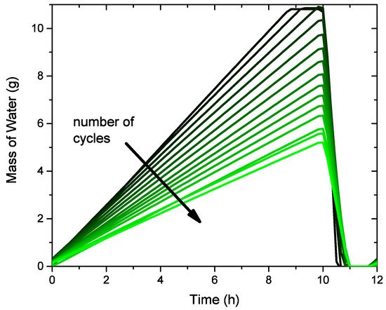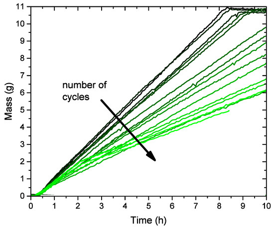 Firstly, a cyclic evaporation/condensation similar to experiment 3 is modeled. Figure 13 shows the predicted mass of water in vessel 2 at different cycles. In this experiment, the upper limit of evaporated water from vessel 1 is set to 10.8 g (similar to experiment 3) and, if this is exceeded, the evaporation rate is set to zero. It is observed that the condensation rate in vessel 2 decreases with the cycles and, likewise, the evaporation rate.