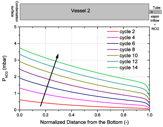 To clarify the drop in evaporation and condensation rates, Figure 14 shows the calculated pressure distribution along the central axis of vessel 2. The normalized distance equals 1 at the point, where the tube connects to the vessel. Obviously, most NCG appear in vessel 2 during condensation whereas in vessel 1 hardly no NCG are observed. According to the model, the flow leads to an accumulation of NCG in vessel 2. The tube between vessel 1 and 2 acts like a diode, as the high flow speed of water molecules herein prevents NCG to diffuse back to vessel 1. The total pressure level in vessel 2 increases due to the leakage of NCG. The maximum absolute pressure difference between vessel 1 and 2 is determined by the water vapor pressure difference in equilibrium of both vessels (in this case 6.5 mbar). Each pressure increase of NCG, implies a decrease of pressure between the water vapor pressure in the liquid and gaseous phase, reducing the condensation rate (see Equation (7)).