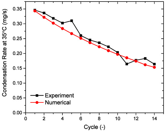 The predicted and measured 8 h averaged condensation rates as a function of the cycle are plotted in Figure 15. Considering the obvious agreement, the model is used to explore hereafter the effects of experimental variables like tube diameter, condensation surface and temperature in the experiment.