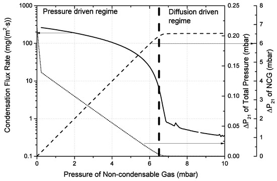 Relation of condensation flux rate () and the pressure of the NCG at the bottom of vessel 2. In this experiment: evaporation in vessel 1 and condensation in vessel 2, with temperatures respectively 35 and 37 C. At 6.5 mbar a transition is observed between a pressure and diffusion driven mass transport process. On the right axis the pressure difference (Total and NCG) between two vessels during the simulation of a high leakage rate, both at the bottom of the vessels.