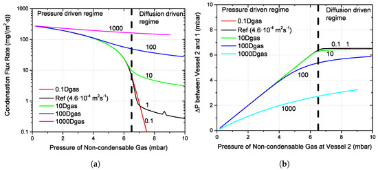 Effects of the NCG diffusion coefficients on the condensation flux (a) and pressure difference (b) as a function of pressures of non-condensable gas at the condensation surface of vessel 2.