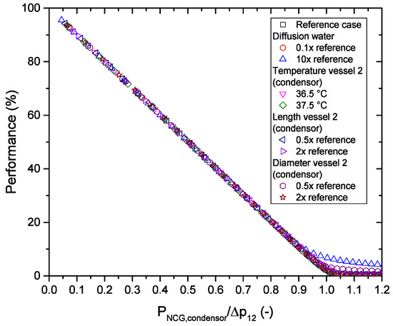The decrease in performance is related to the water transport process, which is convection based at low NCG content into a diffusion based at high NCG content, whereby the transition point is reached when the NCG pressure at the condenser surface is equal to the difference between the equilibrium water pressure of the evaporator and condenser. The geometry on the other hand is of less importance for the performance as long as the tubing between the condenser/evaporator is wide enough that it will not result in a significant pressure drop over the tubing.