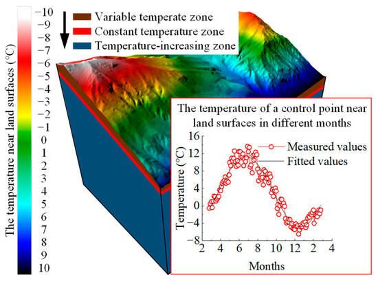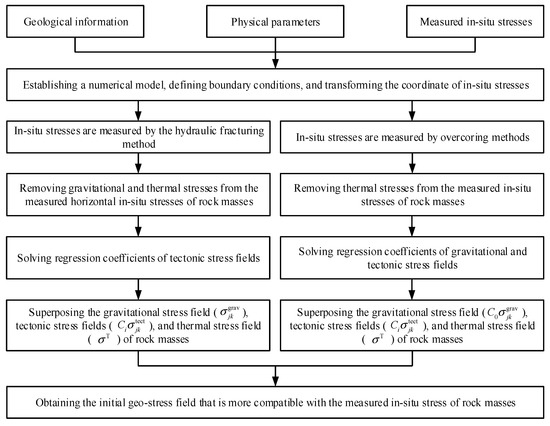 - Based on the information of measured vertical stresses, a workflow for the back analysis of the initial geo-stress field of rock masses considering geo-temperature is proposed (see Figure 4), and this workflow can obtain the initial geo-stress field that is more compatible with the measured in situ stress of rock masses.