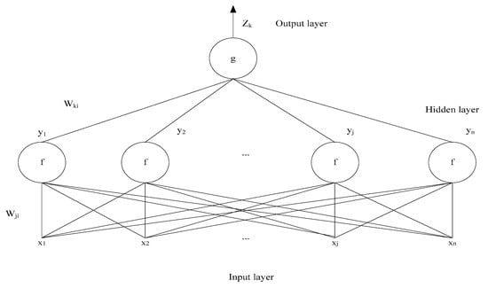 The BP neural network is the application of BP algorithm to the learning of neural network, it is an error back propagation algorithm [23,24]. The mapping relationship between input and output can be obtained through the BP network without describing this mapping relationship in advance. The BP network is powerful, and it can represent any kind of Boolean function and continuous function that approximates arbitrary precision through two layers of networks. A three-layer network structure of BP network can approximate any function with arbitrary precision. A simple three-layer network structure of the BP neural network [25] is shown in Figure 1.