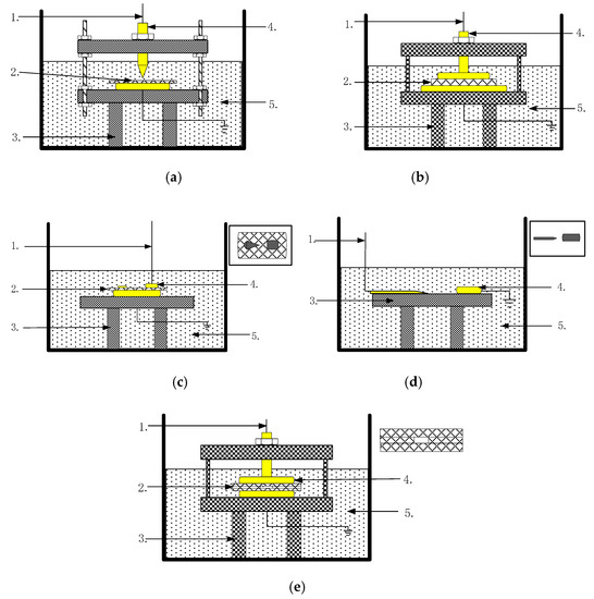 The five types of discharge models: (a) Needle-plate discharge, (b) Sliding-flash discharge, (c) Suspended discharge, (d) Creeping discharge, (e) Plate-to-plate air gap discharge. 1. High-voltage leads; 2. polyethylene test board; 3. PTF bracket; 4. copper electrode; 5. cable oil.