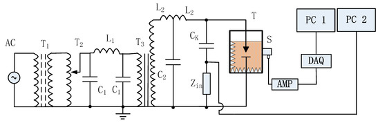 Test system schematic. T1—isolation transformer; T2—voltage regulator; C1, L1—low-pressure, low-pass PI filter; T3—high-voltage experimental transformer; C2, L2—high-voltage low-pass filter; CK—coupling capacitor; Zin—detection impedance; T—tank; S—piezoelectric sensor; AMP—preamplifier; and DAQ—data acquisition card.