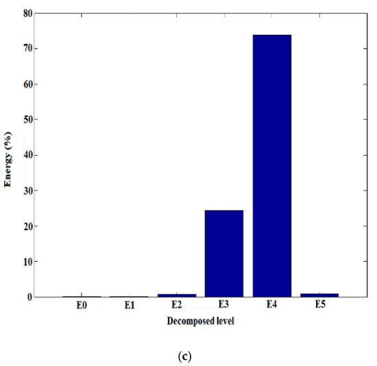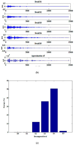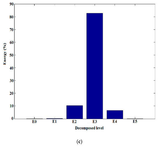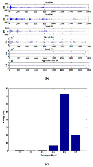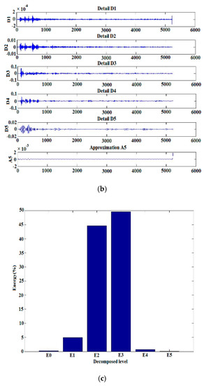 Time-domain wavelet decomposition and energy spectrum of a plate-to-plate air gap PD ultrasound signal: (a) Time domain signal; (b) Wavelet decomposition; (c) Energy spectrum distribution.