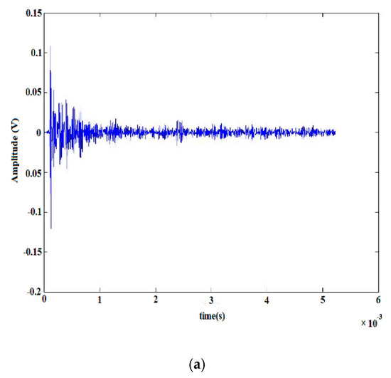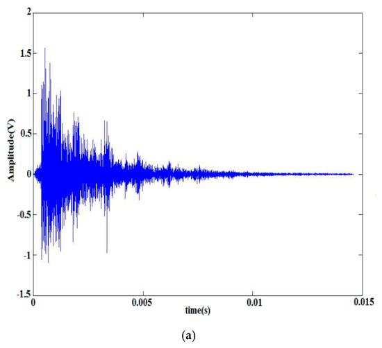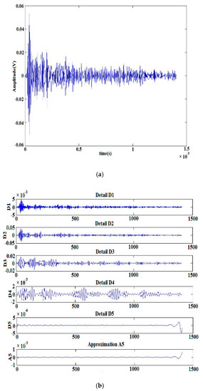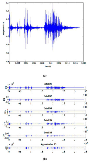 Due to the internal defects of the insulation and the propagation characteristics of the PD ultrasonic signal, the ultrasonic signal is a non-linear signal. For PD ultrasonic signals, such as small-amplitude, fast-fading signals, we use wavelet transform to extract the characteristics of the signals is a very effective method. The process of wavelet transform [28,29] can be understood as the generation of detailed coefficients through a high-pass filter and the average coefficients through a low-pass filter, and due to the characteristics of multi-resolution in the wavelet transform process, the wavelet transform can adjust the resolution according to the characteristics of the signal. The wavelet transform for non-stationary signals is shown in Equation (8):