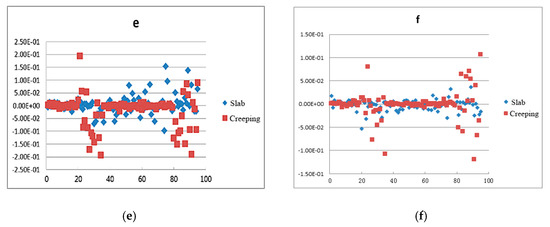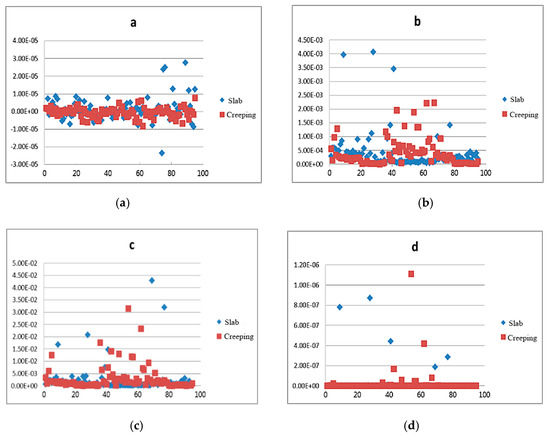 Six parameter distribution diagrams of creeping discharge and plate-to-plate air gap discharge: (a) a parameter distribution; (b) b parameter distribution; (c) c parameter distribution; (d) d parameter distribution; (e) e parameter distribution; (f) f parameter distribution.