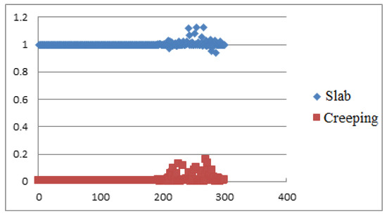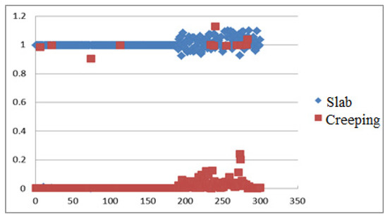 This paper chooses a three-layer neural network, the number of nodes in the hidden layer is 7, and the output layer uses Db10 as the activation function of the output layer, call up Formulas (10) and (11). First, three values of a, b, and e of 100 sets of data are selected and input to the neural network. The neural network is trained and the weight of the neural network is adjusted. Then, after re-selecting 100 sets of new data into the neural network, the ability of the neural network to accurately classify is verified. An output value of 1 indicates a plate-to-plate discharge model, and an output value of 0 indicates a creeping discharge model. Figure 14 shows the results after training the neural network. Figure 15 shows the classification results of the trained neural network for the new data.