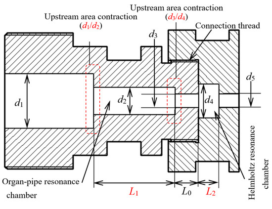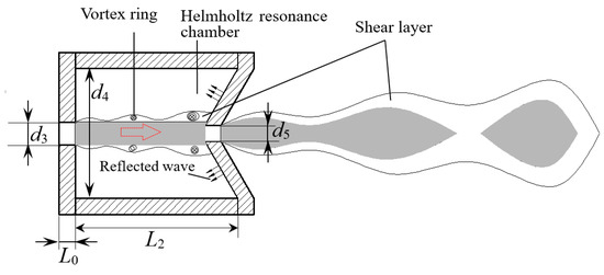 Figure 2. The resonance chamber is the structure where jets oscillation is generated and develops, and the cavity’s shape is cylindrical. Compared to organ-pipe nozzles, Helmholtz nozzles have better jet oscillation performance, especially in the air, but they do not function well under high pump pressure [