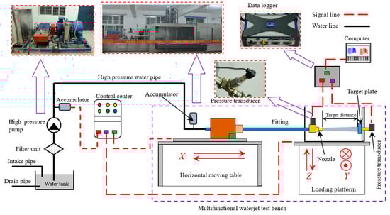 This experiment was carried out on a multi-functional high-pressure water jet test bench. The test bench is composed of four parts, a high-pressure piston pump set, a frequency conversion platform, a test bench, and a control platform. Each component performs unique functions. The experiment used a static pressure sensor to measure the nozzle inlet pressure. Besides, we independently designed a high-pressure water jet pressure test tank to accomplish the experiment. A target disk was mounted on the right side of the water tank, and a measuring hole of 1 mm in diameter was placed in the center of the target disk to measure the striking pressure of the jet center. The connection diagram of the experimental device is shown in
