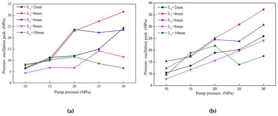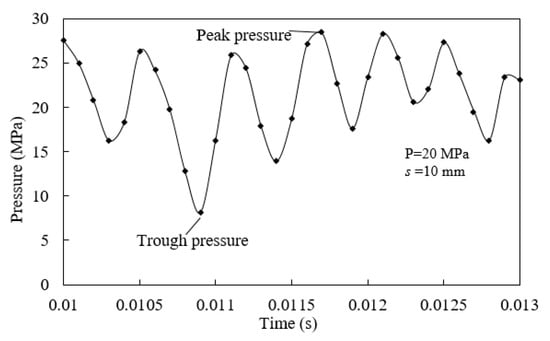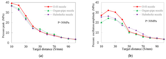In fact, the variation law of the peak pressure and pulsation amplitude of different nozzles with the target distance in different pump pressures is similar in this experiment. Generally, the peak pressure is maximal at s = 10 mm and the pressure pulsation amplitude is maximal at s = 20 mm. The effect of the target distance will not be discussed later.