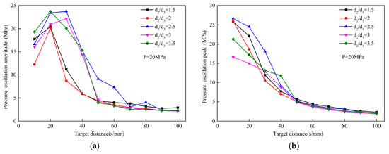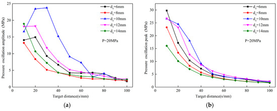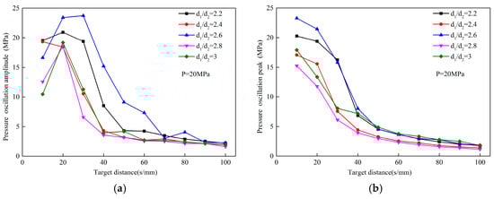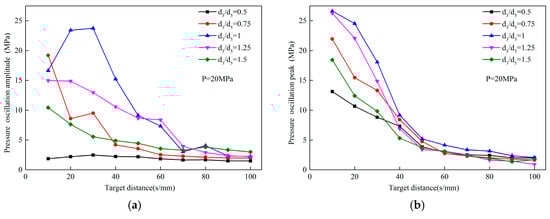 d5 on the peak pressure and pressure pulsation amplitude of the OH self-excited pulse nozzle at the different target distances.