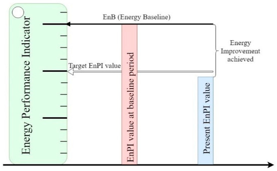 EnPIs are used to understand energy performance related to energy use, EE, and plays an important role in evaluating efficiency and effectiveness of EEM [16,23,24]. Implementing and monitoring EnPIs is very important to support the energy related decision making [33]. EnPI and energy baseline (EnB) are two key interrelated elements that enable the measurements related to EE, use, and performance [16,33,34]. EnB is used as a reference to quantify the energy performance before and after the implementation of the improvement actions [16]. Figure 1 illustrates the relationship between EnPI, EnB, energy target, and measurement of performance before and after implementation [16].