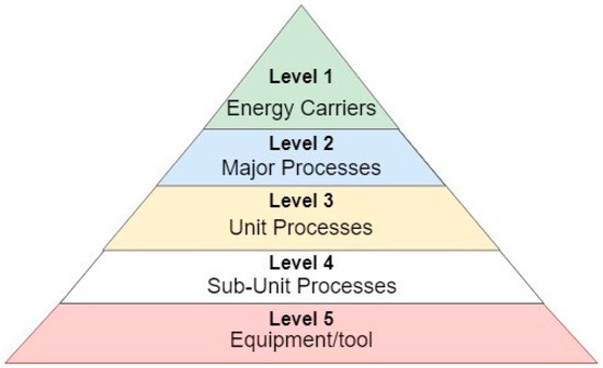 The hierarchical levels are differentiated by conditions such as level of complexity, energy flow direction, the purpose of energy in manufacturing processes and technologies. Adopting the principles listed by McCarthy [18] and translated then into an energy use context, using energy flow as the core attribute, a hierarchical structure of taxonomy has been developed (Figure 4).