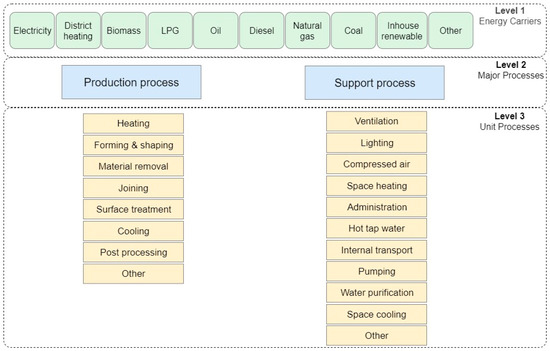 The Level 1 taxon is energy carriers, which characterizes the supply side of the energy flow, and the complexity is low, e.g., it only involves measuring and monitoring at the supply point. It gives an overall picture of the dependence of industry on different carriers. The Level 2 taxon is major processes, i.e., support or production processes. This characterizes the purpose of energy use, i.e., whether it directly contributes to the product’s value added or it contributes to support services. The Level 3 taxon showcases the unit process, which is based on the purpose of a given industrial process. Both Level 2 and Level 3 are derived from Söderström [20]. In this characterization, the unit process is based on the purpose of a given industrial process. The Level 4 taxon is sub-unit process, which characterizes the different technologies used for the unit processes. The Level 5 taxon is equipment/tool, which refers to the individual machinery or equipment that uses energy for its operation, in which different technologies have different types of equipment.
