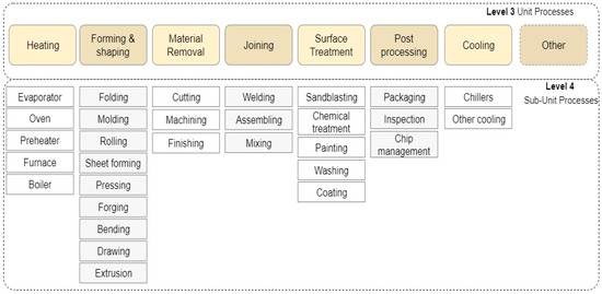 Figure 5 shows, at Level 1, that there are eight varieties of prominent energy carriers, excluding “other”, used in the engineering industry. At Level 2, only two categories are defined, which are support and production. At Level 3, there are separate varieties for the support category and production category. The support category has ten prominent processes, excluding “other”, and the production category has seven prominent unit processes, excluding “other”. Each of the processes has a different role in manufacturing methods or support functions. As shown in Figure 6, each of the unit processes pertaining to the production process has further ranges of sub-unit processes depending on the technology. The reason for not having sub-unit classification is that these processes can directly be classified to Level 5 (equipment level) which, as outlined previously, is only applicable for individual companies, i.e., not generalizable.