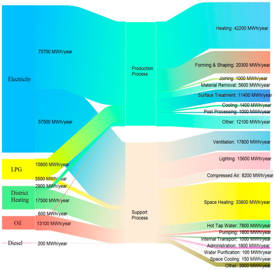 Identifying EEU serves to answer the second research question presented in Section 1 and therefore, the case study has to be used due to the fact that no energy analysis can rely on using literature, requiring categorization instead. Therefore, the energy use of the case study on the Swedish engineering industry is analyzed by adopting the suggested taxonomy in Section 4.1. Figure 7 shows the flow of energy through different hierarchy to each unit process. It should be noted that the energy intensity varies widely between processes. The case study shows that the total EEU is 186,800 MWh annually, in which production process EEU is about 95,000 MWh/year, which is 51% of total EEU, and support process EEU is 91,800 MWh/year, which is 49% of total EEU.