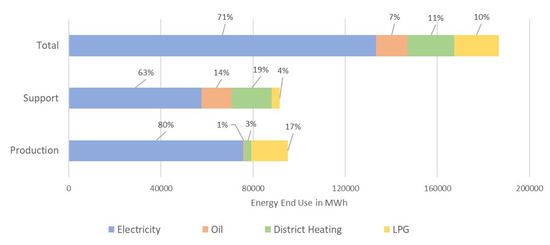 Figure 8 shows the EEU of the energy carriers for the total, the production, and the support categories. Figure 9 and Figure 10 show EEU for each support unit process and production unit process at Level 3 respectively. Appendix A shows the detailed values of each carrier in Figure A1 and Figure A4. It is interesting to note that electricity is the main carrier used for both support and production processes. For the support processes, there is significant use of district heating and oil due to the intensive use of both carriers in space heating and hot tap water. Meanwhile, in production, the significant use of LPG in heating and surface treatment is due to its application in painting. In terms of unit processes, heating is the most energy end-using process among production processes and space heating is the most energy end-using support process.
