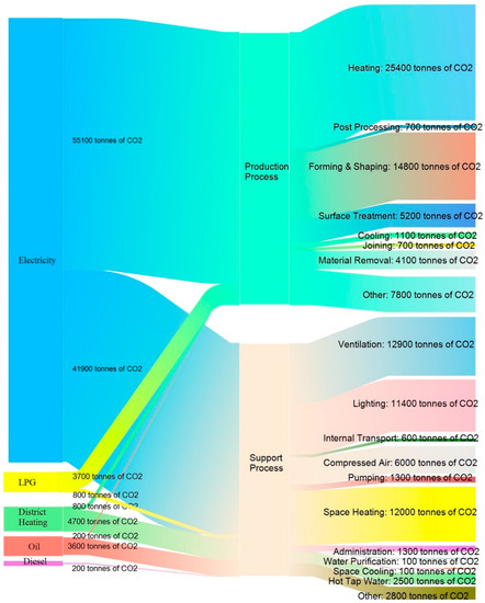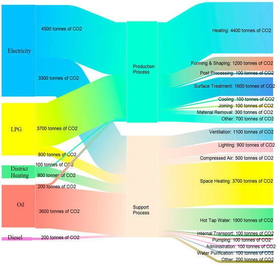 When analyzing EEU and CO2 emissions, the categorization of EEU provides more knowledge on where and how energy is used. This enhances the identification of improvement actions, as also recommended by Sommarin et al. [26]. The data on EEU and CO2 emissions for each process and energy carrier help in targeting the improvement measures for intensive processes. In this case study, 91% of support energy use is from five support processes, which are space heating, lighting, ventilation, compressed air, and hot tap water. These processes are also responsible for most CO2 emissions in support, 94% in the case of scenario 1 and 88% in the case of scenario 2. For the production category, 83% of energy use is from four production processes, which are heating, forming and shaping, surface treatment, and material removal. These processes are also responsible for 83% of the CO2 emissions in both scenario 1 and scenario 2. This result is in contrast with the results in the study by Thollander et al. [13], in which the production processes are not classified. The results in this study are well classified in terms of support and production specifically for engineering industry. Another key detail to be discussed is the difference in CO2 emissions while considering different scenarios. The emissions in scenario 2 are very high compared to the emissions in scenario 1, due to the fact that the energy used at the marginal level is electricity produced in coal power plants and district heating produced in the oil-fired CHPs [38,42].