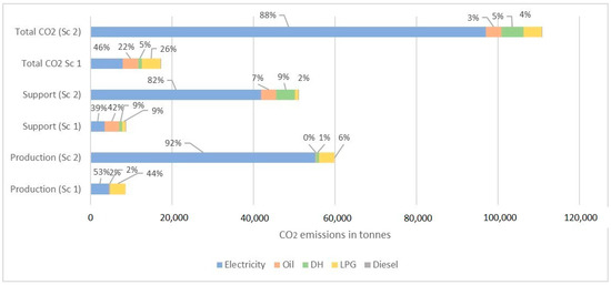 Figure 13 shows the comparison of both scenarios for total emissions, production process and support process. It can be noted that there is a wide gap between CO2 emission values for both scenarios as the marginal emission factor is high. The share from different carriers is also different. For scenario 1 and scenario 2, the major emission intensive carrier is electricity, but for scenario 1 only 46% is from electricity, whereas in scenario 2, 88% of emissions come from electricity. For production, in scenario 1, the major emission contribution is from electricity but only 53%, whereas in scenario 2, the electricity emission is about 92%. For support processes, in scenario 1, major emissions come from oil, at 42%, while in scenario 2, electricity use causes major emissions, amounting to 82%. District heating is the second highest emitter overall and for the support process in scenario 2, whereas LPG takes that position for the production process. In scenario 2, LPG is the second highest emitter overall and for the production process, whereas for the support process it is oil.