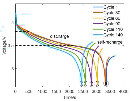 In this paper, IHIs reflecting the capacity of lithium-ion batteries are extracted from the charge and discharge voltage, current, and temperature curves. The discharge process voltage of lithium-ion batteries with different cycles is shown in Figure 2. It can be seen that the time needed to reach the lowest discharge point (named IHI1) decreases with the increase of cycle numbers, and the time decrement from 3.8 V to 3.5 V (named IHI3) is also shortened. The discharge temperature of lithium-ion batteries with different cycles is shown in Figure 3. When the battery temperature rises to the highest point (named IHI2), the time decreases with the increase of the number of cycles. Moreover, the research shows that the following five indicators can also be used as IHIs: IHI4 is the initial maximum slope of the voltage characteristic curve in the process of discharge; IHI5 is the time when the battery temperature reaches the peak value; IHI6 is the initial maximum curvature of the current curve in the process of constant voltage charging; IHI7 is the charging time; and IHI8 is the area under the current curve.