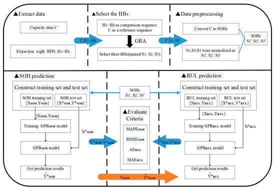 This research focused on the fact that in some practical applications, battery capacity cannot be obtained through online measurement, so it is difficult to predict the SOH and RUL of the battery. A novel SOH and RUL prediction framework of lithium-ion batteries based on GPR with IHIs is developed. Firstly, IHIs replacing the battery capacity are extracted from the data of voltage, temperature, and current, collected by means of some common sensors. GRA is used to select the important IHIs with a high correlation with the battery capacity and to determine the best input. Then, a short-term SOH prediction model is established via the high-dimension GPR model with the linear function as the mean function. According to the predicted SOH and the determined IHIs, the RUL prediction model was developed. The experimental results show that the proposed method in this paper is accurate and effective in SOH and RUL prediction, and that it can significantly improve the prediction performance.