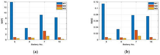 The comparison test results of batteries Nos. 5, 6, 7 and 18 are shown in Figure 5. In order to more accurately reflect the feasibility of the proposed method, the MAPE and RMSE values are shown in Figure 6. It can be observed that the prediction curve of model M3 is the closest to the real capacity degradation curve. Compared with model M3, the prediction result of model M1 is quite different from the real capacity, and it can’t reflect the nonlinear characteristics of capacity degradation. Comparative experiments show that using three IHIs as input data can solve the nonlinear characteristics of capacity degradation. Meanwhile, model M2 uses the IHIs as input data, but the prediction curve is farther away from the real capacity with the increase in cycle numbers. This phenomenon indicates that the GPR without using a linear function as the mean function fails to represent of the overall degradation trend. However, the model M3 has a good prediction performance for capturing the overall degradation trend and tracking the local nonlinear changes.