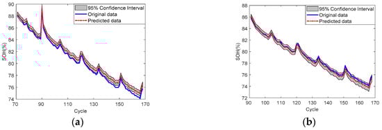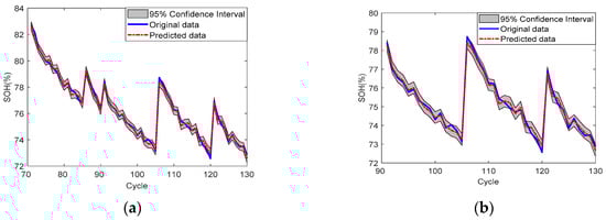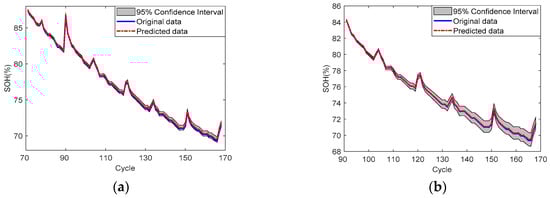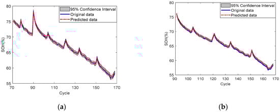 SOH prediction results of battery No. 6: (a) SP = 71; (b) SP = 91.