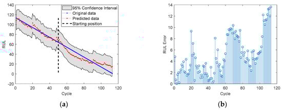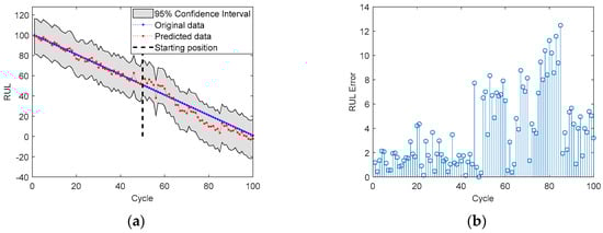 RUL prediction results for battery No. 6 with SP = 51: (a) RUL; (b) RUL prediction Error.