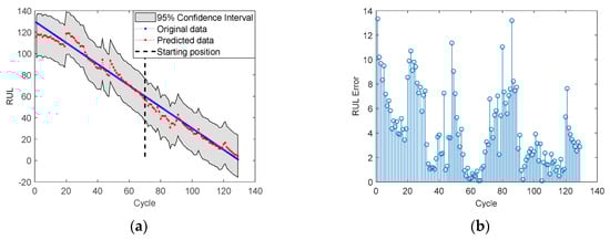 RUL prediction results for battery No. 6 with SP = 71: (a) RUL; (b) RUL prediction Error.
