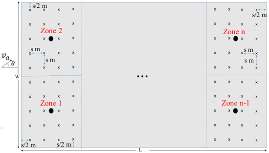 A generic rectangular prism type fruit orchard with dimensions L m × W m × H m (H is the height of trees) and consisting of n subzones is considered. We assume one hot air blower per zone to heat air around the trees in each zone for frost prevention during frost periods. The distance between roots of trees is s m. The 2-D geometry of the described generic orchard is given in Figure 1. We assume the diameter (the diameter of the approximately circular region covered by branches of a tree) to be d m. The climate data (consisting of wind speed, wind direction, and sky and ground temperatures) are also taken as model inputs.