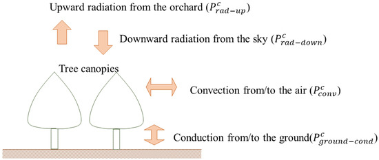 The temperature of the tree canopy changes by gaining or losing energy from or to the surroundings, as shown in Figure 2. Therefore, it can be calculated dynamically as: