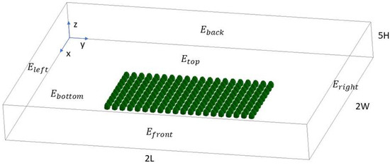 As shown in Figure 3, the computational domain for the fruit orchard is taken as a rectangular prism. The temperature boundary conditions for the ground and the sky are specified as constants, assuming their surfaces are maintained at fixed temperatures during the frost event. Four side boundaries, including left, right, front, and back, are set as an inlets or outlets depending on the wind direction. The temperature boundary condition for the inlet is specified as a logarithmic temperature profile where the temperature at the bottom end (the ground) and at the top end (the sky) are set to and , respectively. The temperature boundary condition for the outlet is set as a no-flux boundary.