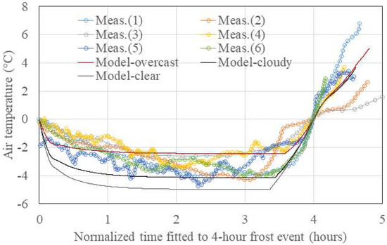 The thermophysics models described in Section 2.3 predicted the temporal variation of air temperature in an orchard. For the validation of the thermophysics models, the air temperature determined by heat exchanges with the canopy, ground, and sky was compared to the field measurements conducted in a peach orchard and an orange orchard by Ghaemi et al. [24]. As shown in Figure 4, the air temperatures in the orchards during six frost events were compared to the CFD simulation results for three frost episodes (mild, medium, and severe frost levels), which are described in detail in the case study given in Section 3. The simulated air temperatures decreased at the beginning of the frost events due to radiative cooling and increased at the end of the frost events due to solar heating. The frost intensity of the six frost events was not determined by Ghaemi et al. [24], and, therefore, the simulated air temperature variations of three frost cases cannot be directly compared with those of the six measured frost events. In Figure 4, some measured air temperatures dropped to the simulated ones of the “clear” (severe) case, while most measured air temperatures ranged between the “overcast” (mild) and “cloudy” (medium) cases. Therefore, we believe that the simulated air temperatures of the three frost events were in the range of real frost events. Although the air temperatures decreased slightly steeply compared to the field measurements, the overall air temperature variations were in good agreement with the actual frost events because in the simulations the temperature drop when the frost occurred and radiation balance at the time of frost were more important than the steep air temperature drop before the frost occurred.