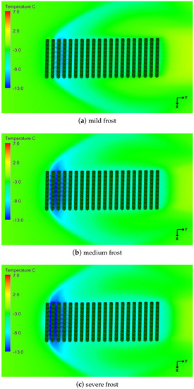 The cloud cover constants (C, see Equation (8)) were set to 1.0, 0.6, and 0.0 for mild, medium, and severe-level frost episodes, respectively. The severe frost condition occurs due to extreme radiative cooling for clear sky (), while the mild frost is due to low radiative cooling for a totally overcast sky (). Finally, it is assumed that a frost episode lasts 4 h. The simulation of each such frost event took around 5 days using a computer with an Intel i7-7800X (3.5 GHz) CPU and 64 GB RAM.