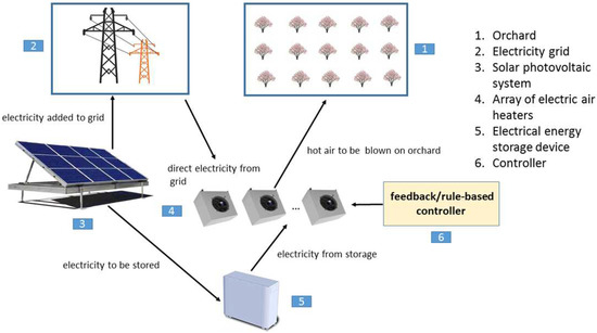 Using the developed parametric CTFD model, we showed in the previous section that the minimum energy required to prevent a frost episode in a test Prunus armeniaca orchard consisting of 200 trees is in the range 734–1250 kWh. Active frost prevention systems integrating renewable energy sources (for example, photovoltaics, solar-thermal, and geothermal) can be designed to partially or fully provide this energy. An example, a photovoltaics-based (PV) system, is illustrated in Figure 9. Here, in the PV-assisted framework, solar energy is used as a secondary application for frost prevention (the primary application is electricity production for the grid). The PV-based system is mainly be used to produce electricity to be added to the grid. It is necessary to store some of the electricity produced when the frost periods approach. The size of storage unit depends on the size of the fruit orchard and the predicted frost level. The electricity from the grid or storage device is used to heat air by an array of electric air heaters where, again, the capacity of heaters in the array depends on the size of the orchard and the frost level. The heated airis blown by fans on fruit trees during freezing days. The frost prevention control system controls the blowing time and the mass flow rate of the heated air. The PV-based frost prevention system is a good choice for regions with a rich solar radiation level.